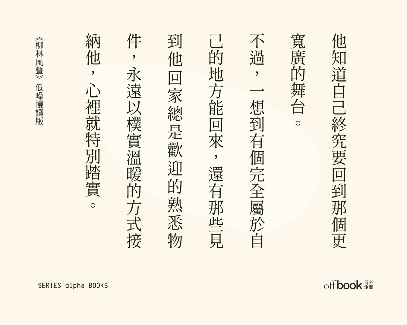 ➀ 他知道自己終究要回到那個更寬廣的舞台。不過,一想到有個完全屬於自己的地方能回來,還有那些見到他回家總是歡迎的熟悉物件,永遠以樸實溫暖的方式接納他,心裡就特別踏實。
