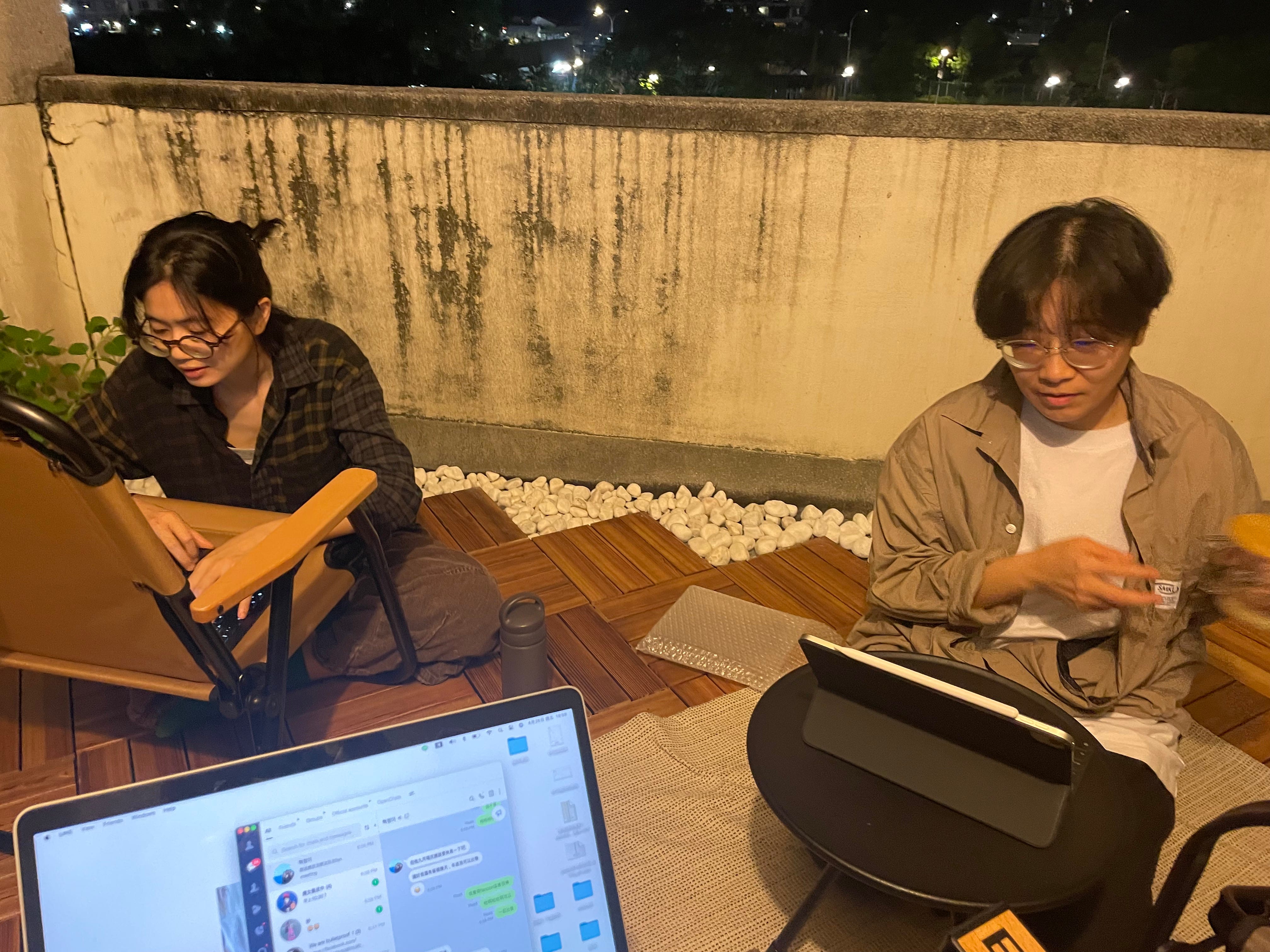 🅐❶|2024 年應該是中旬,每週都會有一天的遊牧日,一起在阿倪家討論專案任務,或者各自做手邊的工作。那陣子正好阿倪跟簡老闆佈置了陽台,打造了一秒即有露營感的空間,遊牧日就會跑到陽台,吃飯、開會、工作(累了還可以看山?)團隊平常都是各自在家隔著螢幕工作,有了遊牧日之後,彼此的緊密度更高,一週見一次的距離也很剛好哈哈哈哈,喜歡今年的這個改變。